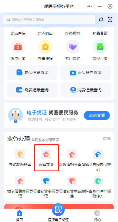 第一步:下載“湘醫(yī)保”App,或進入“湘醫(yī)保”App小程序,登錄后在首頁“業(yè)務(wù)辦理”中找到“家庭共濟”,點擊“共濟申請”。