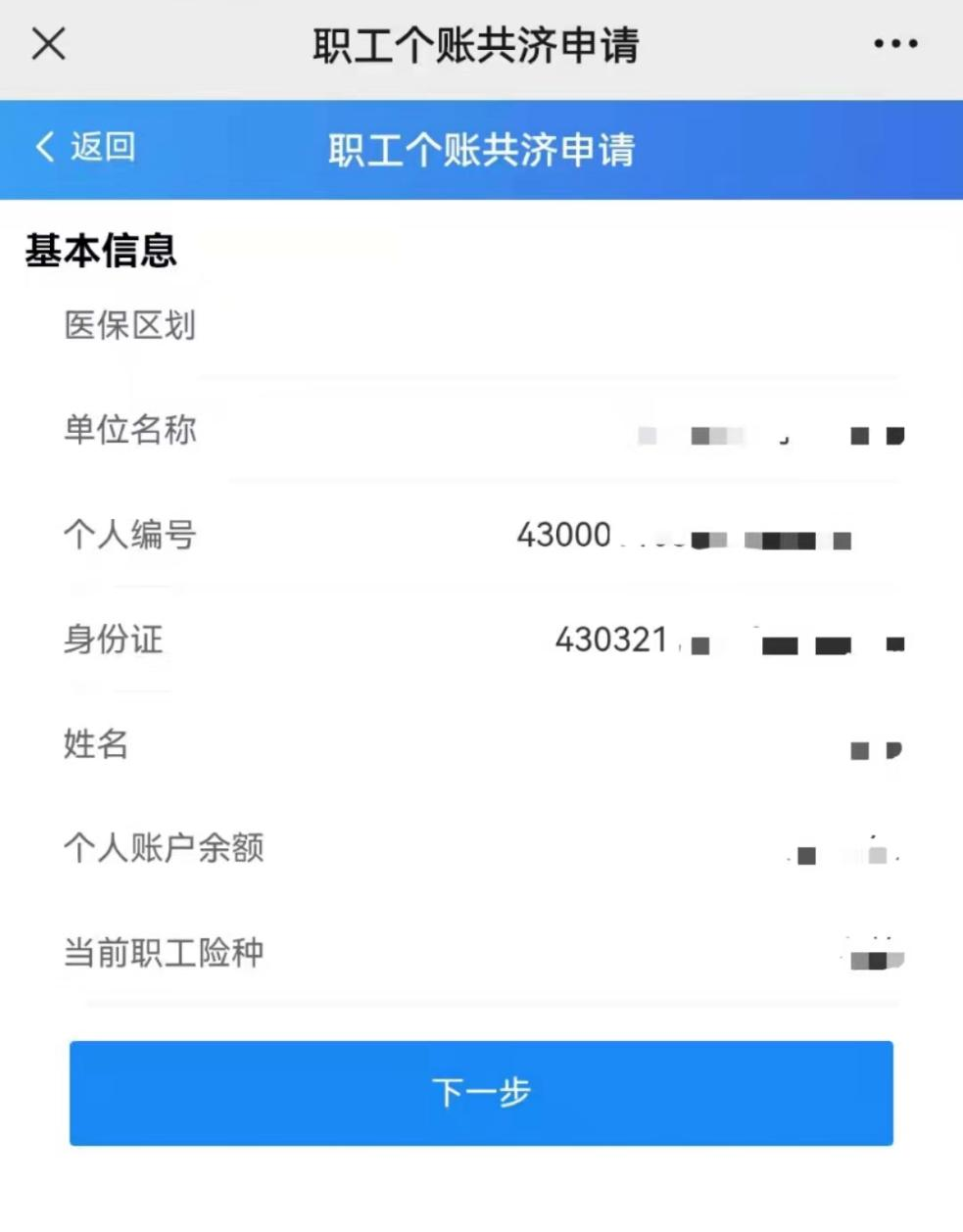 第二步:確認參保信息,在個人賬戶有余額且參保狀態(tài)正常的情況下,點擊下一步。